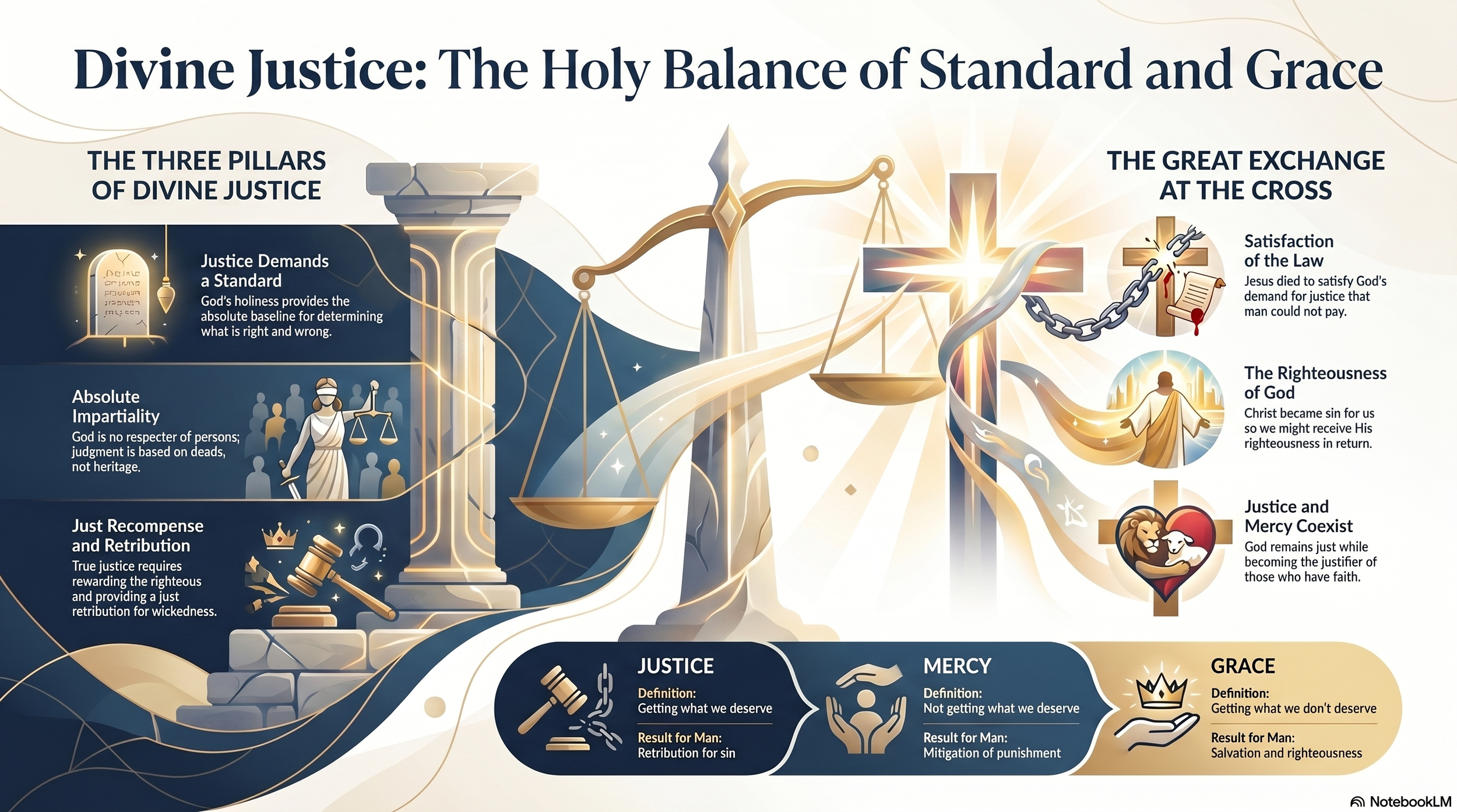 In this lesson, we examine the profound reality that God's justice demands a perfect standard of righteousness [20:09]. While all of humanity deserves punishment for falling short, God’s justice is beautifully satisfied through the cross of Jesus Christ [32:01]. Because Christ took on our sins, Believers are covered by His righteousness, allowing God to be fully just and infinitely merciful [46:09]. We also explore the importance of leaving vengeance to the Lord and the necessity of making righteous judgments rather than hypocritical ones [49:18, 54:00]. Ultimately, this study challenges us to live in awe of the grace we have received and to continually pursue a deeper, more mature walk of faith. By understanding His true nature, we are equipped to reflect His excellence in our daily lives.