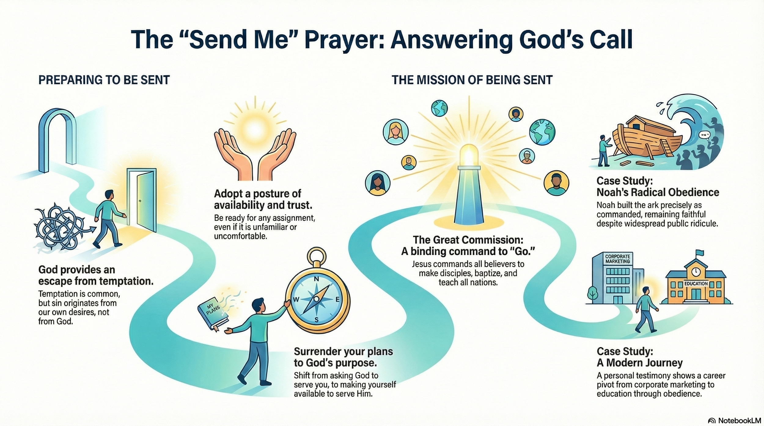 This lesson explores the dangerous prayer “Send me” as a call to availability, obedience, and trust in God’s purposes. Using 1 Corinthians 10:13 and James 1:13–15, it clarifies the nature of temptation, emphasizing that God does not tempt us but faithfully provides a way of escape when we remain connected to Him. The lesson highlights biblical examples of being sent—such as Noah, Abraham, Moses, the apostles, and ultimately Jesus—showing that obedience often requires courage, surrender, and faith amid uncertainty. Special focus is given to the Great Commission as a binding command to go, make disciples, baptize, and teach continually. Through personal testimony and practical church application, students are encouraged to surrender their plans, purify their motives, and make room for God to use their gifts in service. The lesson concludes by challenging believers to move from comfort to commitment, trusting God’s presence as they answer His call.