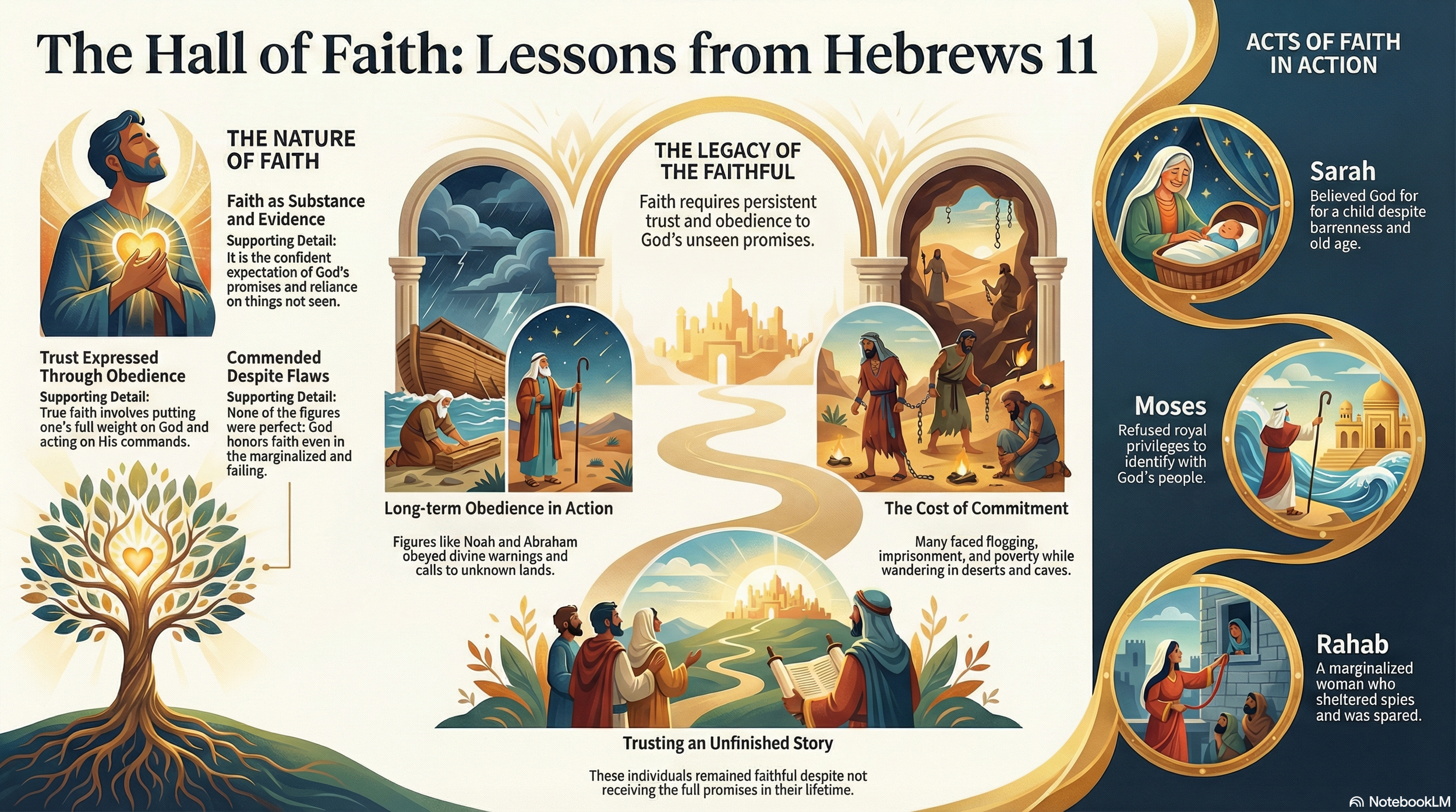 In this lesson, we explore the profound definition of faith found in Hebrews Chapter 11, understanding it not as a passive belief but as the "substance of things hoped for" and the "evidence of things not seen". We examine the inspiring lives of Old Testament figures such as Abel, Noah, Abraham, and Rahab, who demonstrated faithful obedience even when God's promises seemed distant. You will learn how these ancient believers navigated trials, persecution, and the unknown by placing their full weight on God's word. This study challenges us to move beyond theory and apply this same persistent trust to our daily walk, regardless of the cultural or personal pressures we face today. By looking to this "great cloud of witnesses," we find the encouragement to run our own race with endurance and unwavering hope. Finally, we see how God’s eternal plan connects their faithfulness with ours, perfecting us together in Christ.