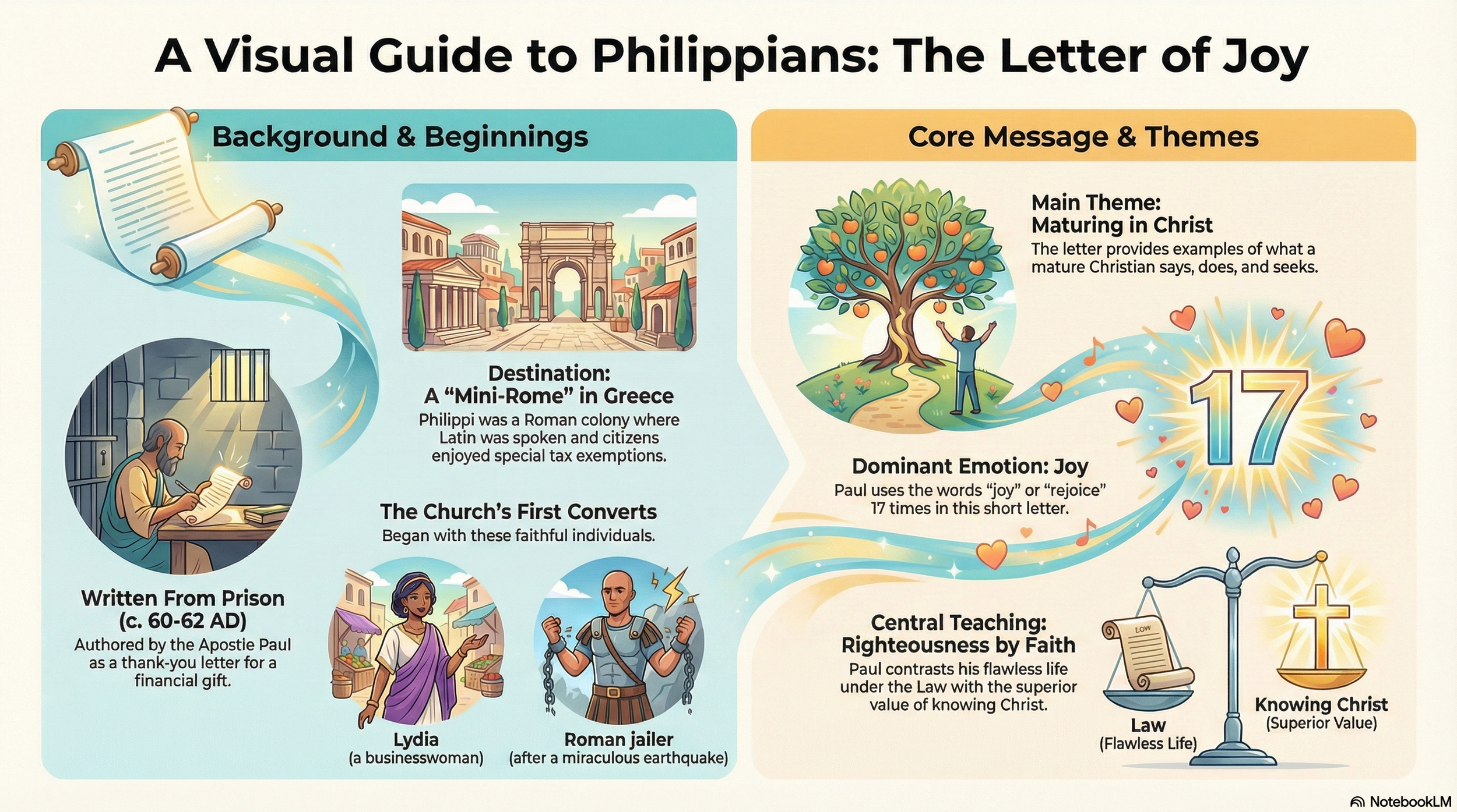 Explore Paul's joyful letter to the Philippians, written from prison yet overflowing with hope. Learn essential Scripture study guidelines, discover the founding of the Philippian church through Lydia and the jailer's conversions, and uncover six powerful truths: peace beyond circumstances, true humility, pressing forward, heavenly citizenship, contentment in trust, and joy in Christ. Rejoice in the Lord always!