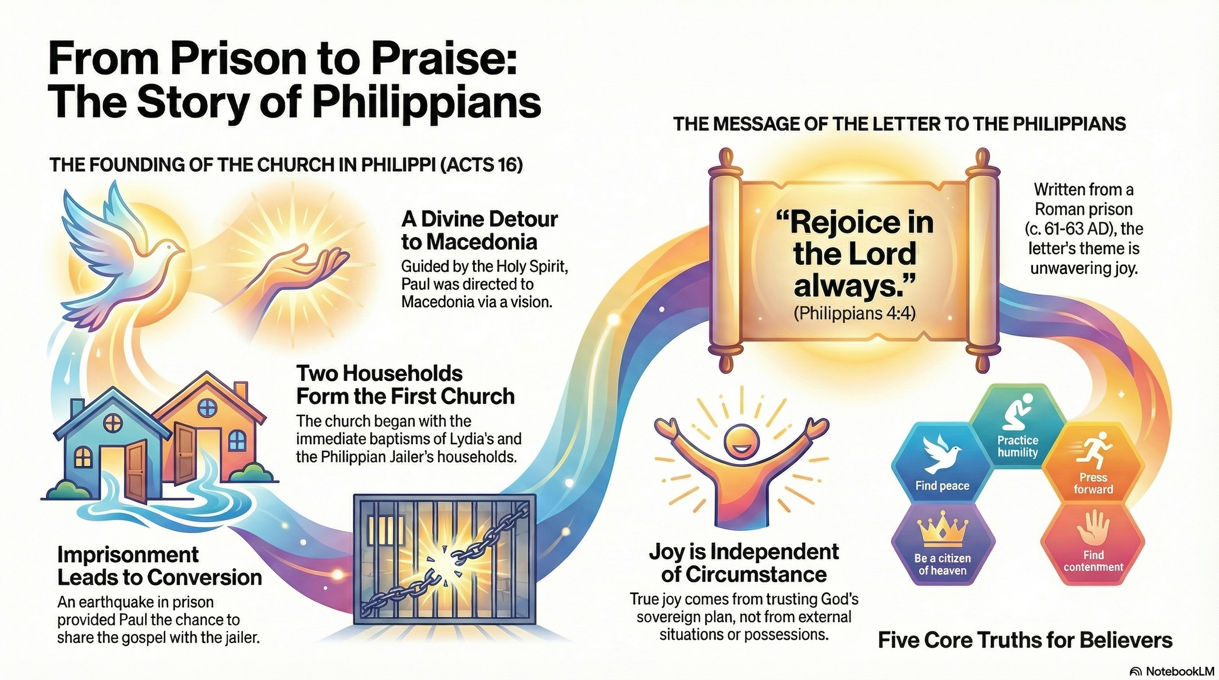 Discover the historical and spiritual foundations of Paul's letter to the Philippians, one of the most joyful books in the New Testament. This lesson explores Paul's second missionary journey to Philippi, a cosmopolitan Roman colony on the ancient Silk Road, where the church was established through the conversions of Lydia and the Philippian jailer. Learn the four essential guidelines for studying Scripture: recognizing all Scripture is God-breathed, understanding historical context, discerning God's message, and applying lessons to daily life. Despite writing from prison in Rome, Paul's central message rings clear: "Rejoice in the Lord always." The lesson reveals six core truths woven throughout Philippiansโpeace beyond circumstances, true humility through Christ, pressing forward with purpose, heavenly citizenship, contentment in trust, and joy as the fruit of abiding in Christ.
