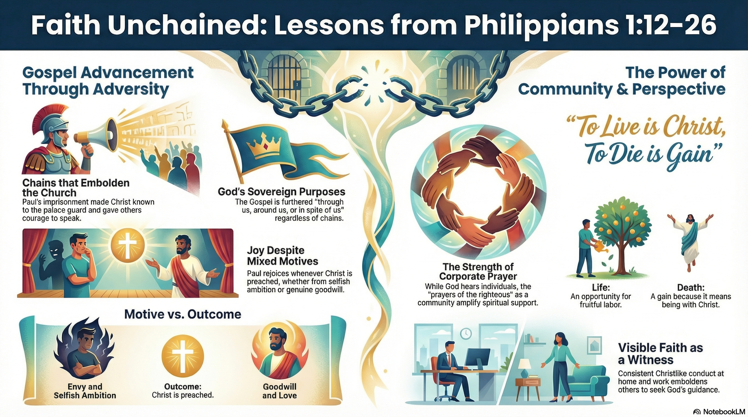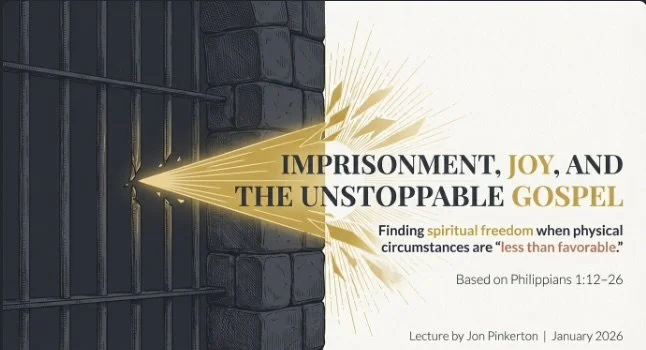 In this lesson, we examine Philippians 1:12-26, where Paul demonstrates how his imprisonment paradoxically advanced the gospel, making Christ known throughout the palace guard and emboldening believers to speak without fear. We explore the tension between mixed motives in preachingβsome from envy and selfish ambition, others from loveβyet Paul rejoices because Christ is proclaimed regardless of human intentions. The session highlights the critical role of communal prayer and the Spirit's supply in sustaining faithful witness, as Paul confidently expects deliverance through the prayers of the righteous. We confront Paul's profound perspective that "to live is Christ, and to die is gain," examining how this fearless view of death enables bold ministry and fruitful labor for others' spiritual progress. Through practical applications and testimonies from Italy and Southern Africa, we learn to maintain joy in unfavorable conditions, stand visibly for Christ in our homes and workplaces, and trust God's sovereignty to accomplish His purposes through us, around us, or even in spite of us. This lesson equips believers to face contemporary challenges with the same spiritual courage that enabled Paul to magnify Christ whether by life or death.