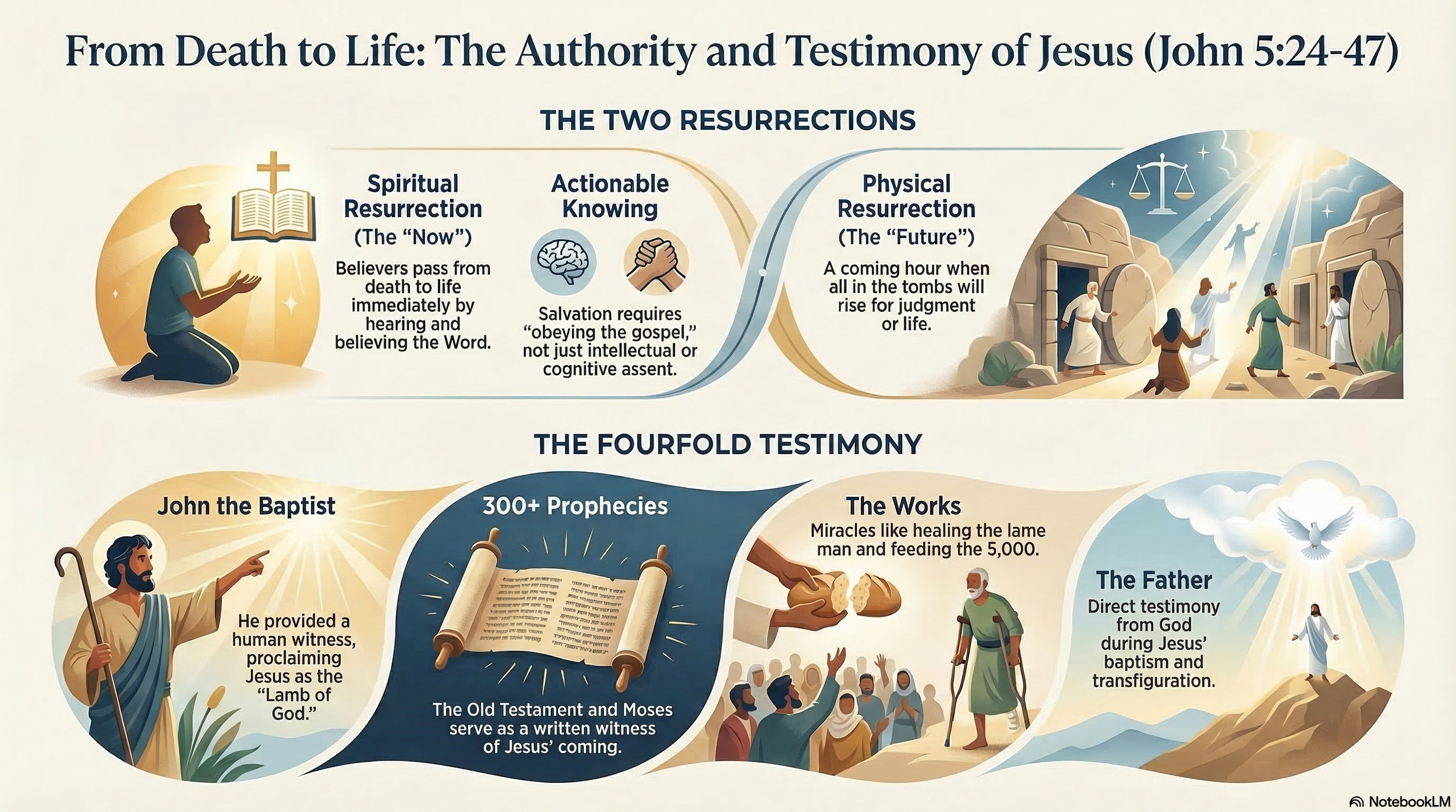 In this pivotal session covering John 5:24–47, Tony Padgett leads us through Jesus' confrontation with His opponents, anchored in the staggering promise of verse 24 — that everyone who hears His word and believes in the Father who sent Him has already passed from death to life and possesses eternal life. Rather than simply asserting His identity, Jesus presents four legally and spiritually compelling witnesses: John the Baptist, who proclaimed Him the Lamb of God; God the Father, who spoke from heaven at His baptism and transfiguration; His miraculous works, which no sorcerer could duplicate; and the Scriptures themselves, including Moses and the prophets, who foretold His coming in hundreds of fulfilled prophecies. The lesson draws a sharp distinction between the spiritual resurrection available to believers now — hearing the voice of the Son of God and living — and the future physical resurrection on the last day, when all in the tombs will rise either to life or to judgment. We are soberly warned against cognitive dissonance — knowing the truth intellectually yet refusing to surrender to it, often because of tradition, social pressure, or the fear of losing standing among men. Moses himself pointed forward to Christ, yet those who claimed Moses as their champion refused to come to the very One he testified about. This lesson is an urgent call to move from head knowledge to heart obedience — to know God not as a last resort or a convenience, but as Lord — and to obey the gospel before the day of reckoning arrives.