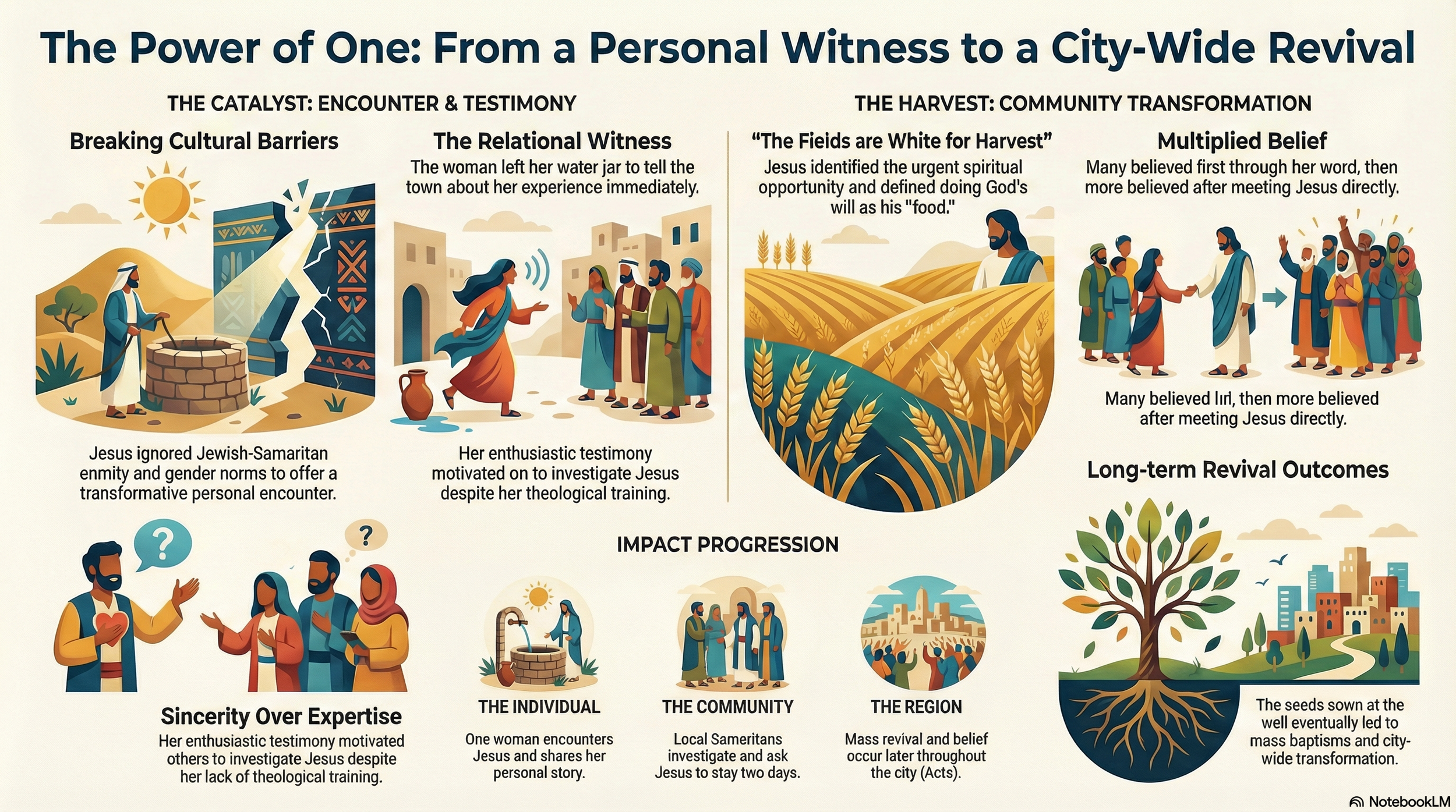 In this lesson, we examine John 4:27-54 and discover how the Samaritan woman's immediate, enthusiastic testimony led many in her city to encounter Jesus Christ. Despite cultural barriers, personal reputation, and limited theological understanding, her sincere witness motivated an entire community to investigate the Messiah for themselves. We'll explore Jesus' teaching about spiritual "food" and the harvest field that is "white for harvest," emphasizing the urgency and opportunity in evangelism. Through this powerful account—and its later fulfillment when Philip preached in Samaria—we learn that one person's faithful witness can plant seeds that produce extraordinary spiritual fruit. This lesson challenges us to examine our own motives in worship, avoid preconceived notions about who might receive the gospel, and recognize that personal invitation remains one of the most effective evangelistic methods available to every believer.