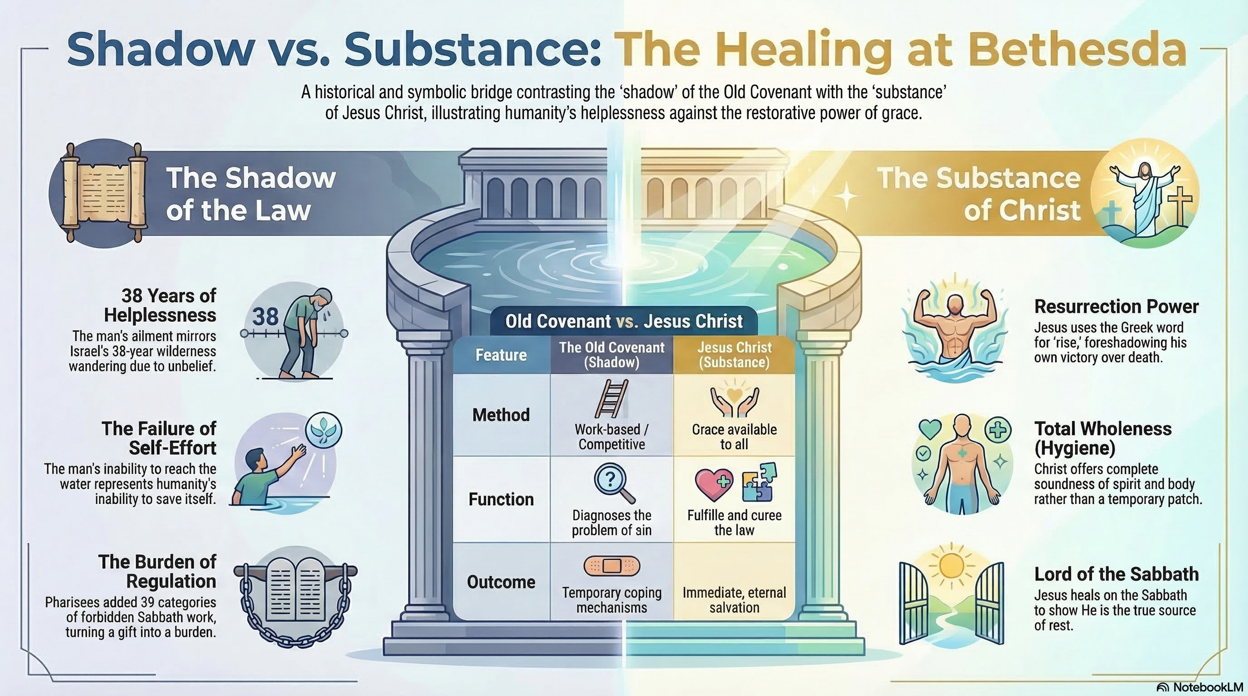 The Pool of Bethesda, a place of desperate hope for the sick and suffering, becomes in John 5:11–16 a theological stage where Jesus exposes the powerlessness of human effort and declares Himself the only true source of complete wholeness. The man's 38-year battle with helplessness is not an incidental detail — it is a deliberate Old Testament echo, mirroring Israel's 38 years of wilderness wandering (Deuteronomy 2:14), announcing that humanity, like that nation, cannot save itself through striving or effort. When Jesus commands the man to "rise, take up your bed, and walk," He speaks the language of resurrection itself — the very same voice that will one day call the dead from their graves now calls a lame man to his feet. The Sabbath controversy that follows exposes a sobering truth: the Pharisees, with their 39 man-made categories of restriction, were more troubled by a man carrying his mat than by the miracle God had just performed in their midst, revealing how religion turned inward can bury the very mercy it was meant to celebrate. Jesus, as Lord of the Sabbath, is the rest the law always promised but could never deliver — He is not a supplement to human effort but the complete substance to which every Old Testament shadow was pointing. His final charge — "sin no more, that nothing worse may happen to you" — calls every believer to pursue not merely physical healing but complete, ongoing wholeness in Christ, the only One who offers not a patch or a coping mechanism, but full restoration of body and soul.