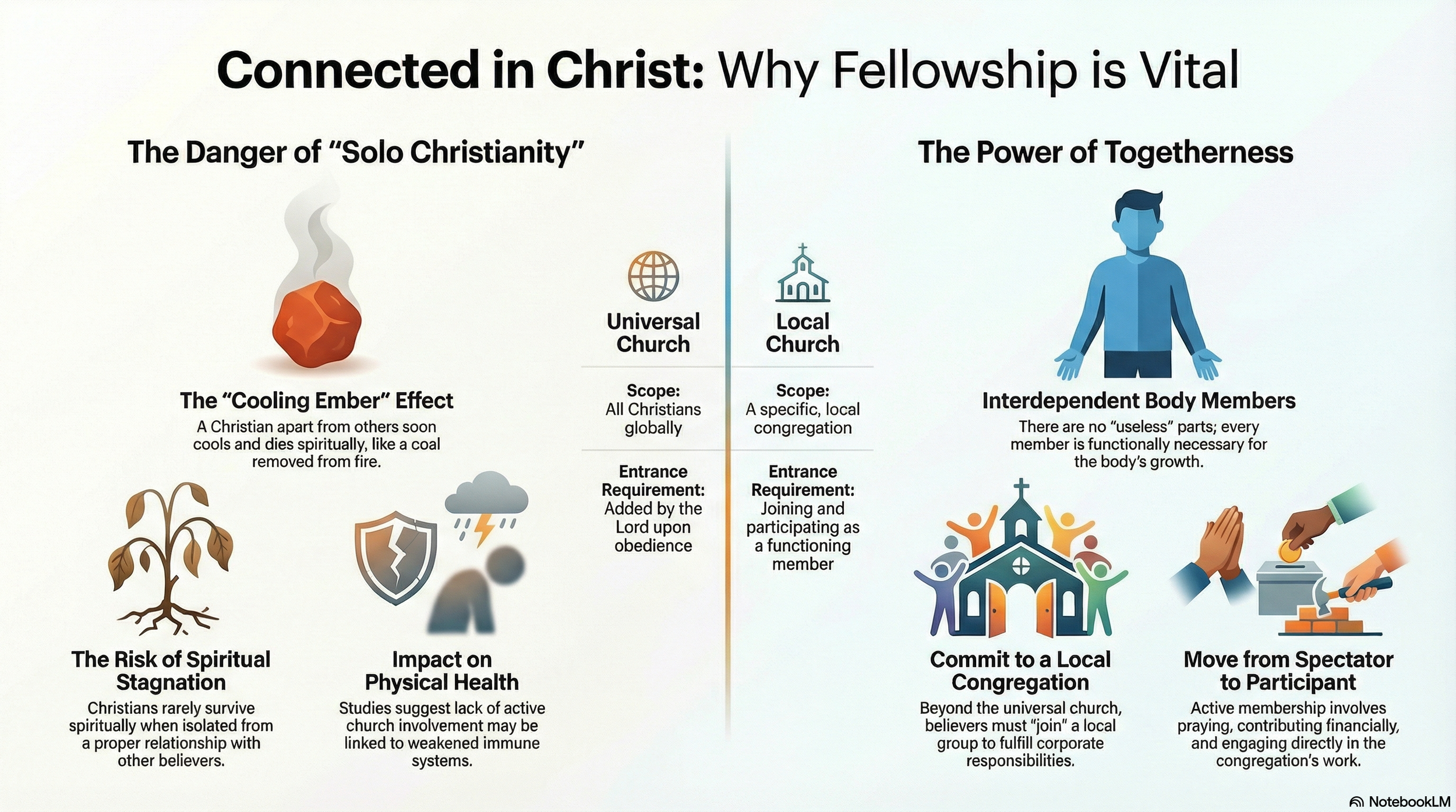 The final lesson in the series addresses the danger of "solo Christianity" and the divine design for believers to function as interdependent members of one body. It emphasizes that spiritual survival and growth are tied to our connection with other Christians through the local congregation.