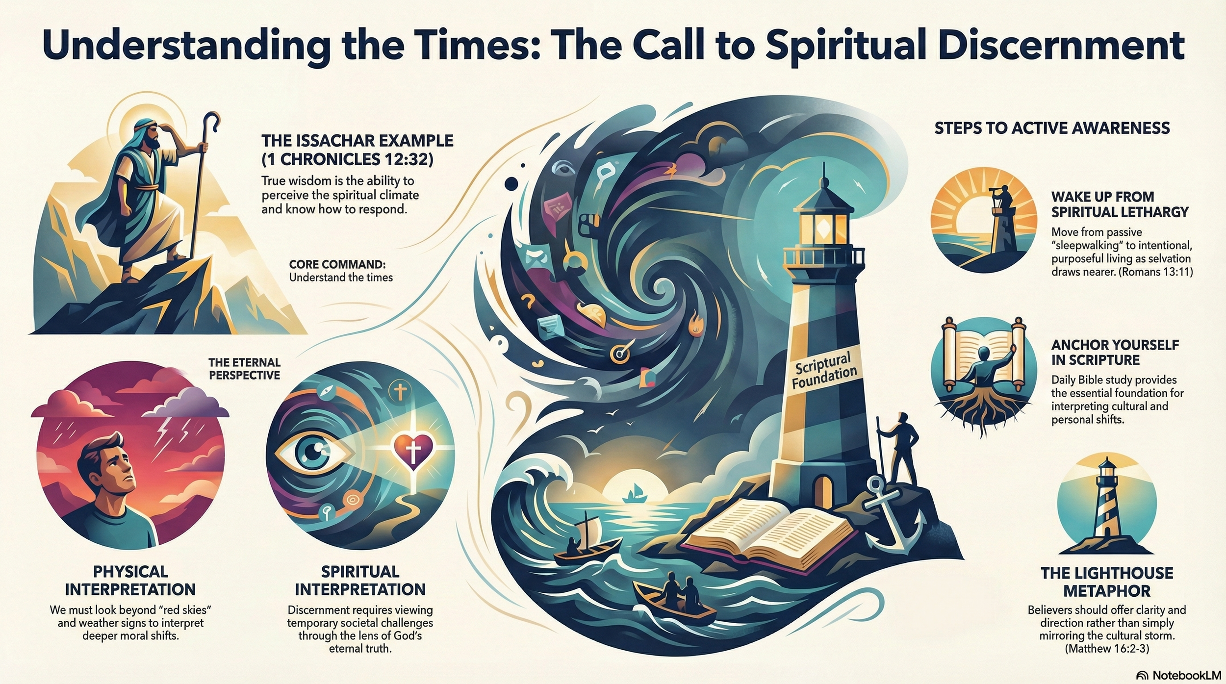 The sons of Issachar were distinguished among all of Israel's warriors for something far more valuable than physical strength — they understood the times and knew exactly what God's people ought to do. In this lesson, we examine what it means for the modern believer to develop that same rare quality: the ability to read the spiritual and moral climate of our era with discernment, purpose, and faith rather than fear or confusion. We explore how Jesus rebuked those who could forecast the weather yet failed to interpret the signs of the times, and we ask ourselves the same hard question: are we any different? Drawing from Scripture, history, and honest reflection on the world around us, you will build a biblical framework for understanding the age in which God has deliberately placed you. This lesson challenges you to move beyond surface-level awareness into the kind of deep, prayerful discernment that transforms how you live, decide, and lead — right now, in these times.